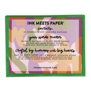 Letterpress-printed greeting card with green square-flap envelope. Available as a single card or boxed set of six.